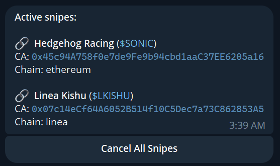 This simple menu just let's you check your active snipes, and gives you the option to cancel all of them.