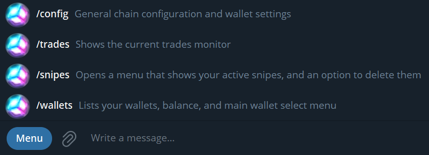 <figure><img src="https://4233228024-files.gitbook.io/~/files/v0/b/gitbook-x-prod.appspot.com/o/spaces%2FIPiWemJjk1w7YWNZz779%2Fuploads%2Fgit-blob-dca1939807ba175f8795d761aba0ef87203a1a63%2Fimage%20(93).png?alt=media" alt=""><figcaption><p>You can press the Menu button next to the chat box to see the main commands</p></figcaption></figure>