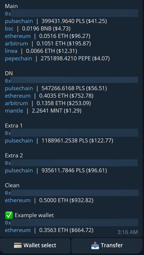 Using this command or accessing it through the configuration menu will show a list of all your wallets, and the balances in any chain supported by the bot, plus the dollar values.