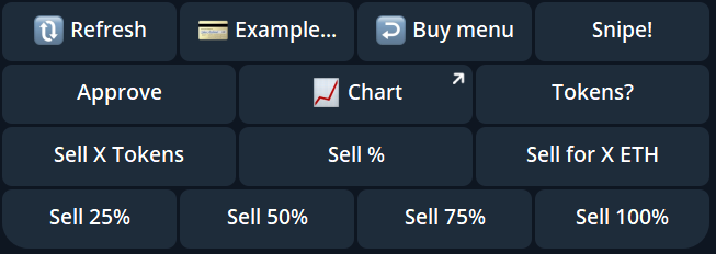 ![](https://4233228024-files.gitbook.io/~/files/v0/b/gitbook-x-prod.appspot.com/o/spaces%2FIPiWemJjk1w7YWNZz779%2Fuploads%2Fgit-blob-2009c0c3e2afc9a57a18b17f19518ad606a1952a%2Fimage%20\(22\).png?alt=media) Sells an exact amount of tokens, but using a percentage of the wallet's holdings. For example, sending 33 will sell 33% of your tokens.